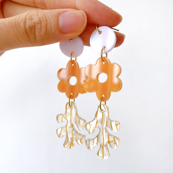 Acrylic statement Flower Earrings. Lazer cut matte orange flower and pearl coral design, with spring vibes. These earrings measure 2cm wide by 7cm length.
