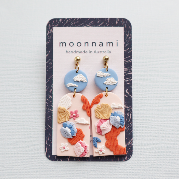 Statement Cloud Blossom Earrings in Long Arch. These soft peach earrings have intricate flower blossom suspended in the clouds.