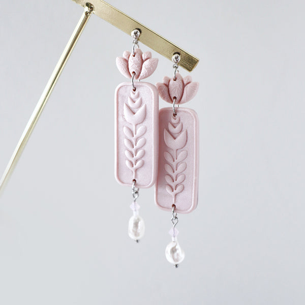 Statement piece embossed floral and lotus top in Ballet Pink with Freshwater Pearls, White Miyuki Beads and Czech Glass Beads. This pair of lightweight elegant earrings in the Pearl Line collection measures approximately 1.8cm wide by 7.5cm length.