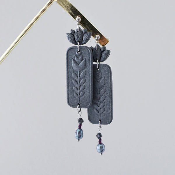 Floral Emboss Statement Earrings in Grey Black