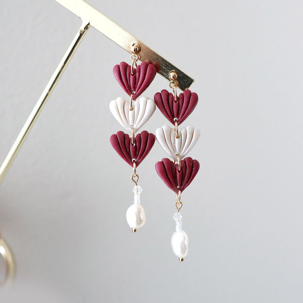 Elegant and One-Of-A-Kind Queen of Triple Hearts Earrings in Deep Red with Freshwater Pearls, White Miyuki Beads and Czech Glass Beads. This pair of very lightweight elegant earrings in the Pearl Line collection measures approximately 1.5cm wide by 7cm length.