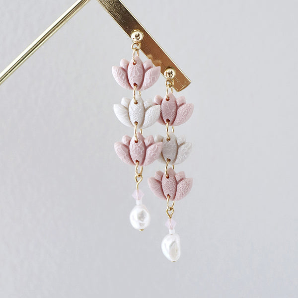 Elegant and One-Of-A-Kind Triple Lotus Drop Earrings in Ballet Pink with Freshwater Pearls, Black Miyuki Beads and Czech Glass Beads. This pair of very lightweight elegant earrings in the Pearl Line collection measures approximately 1.5cm wide by 6cm length.