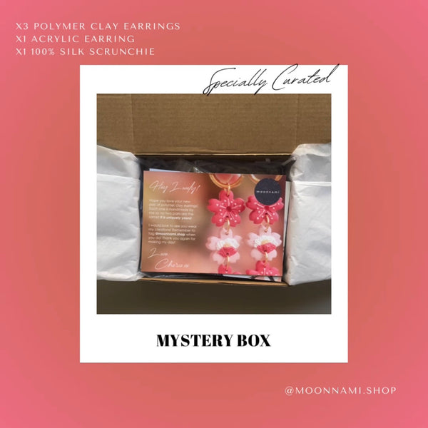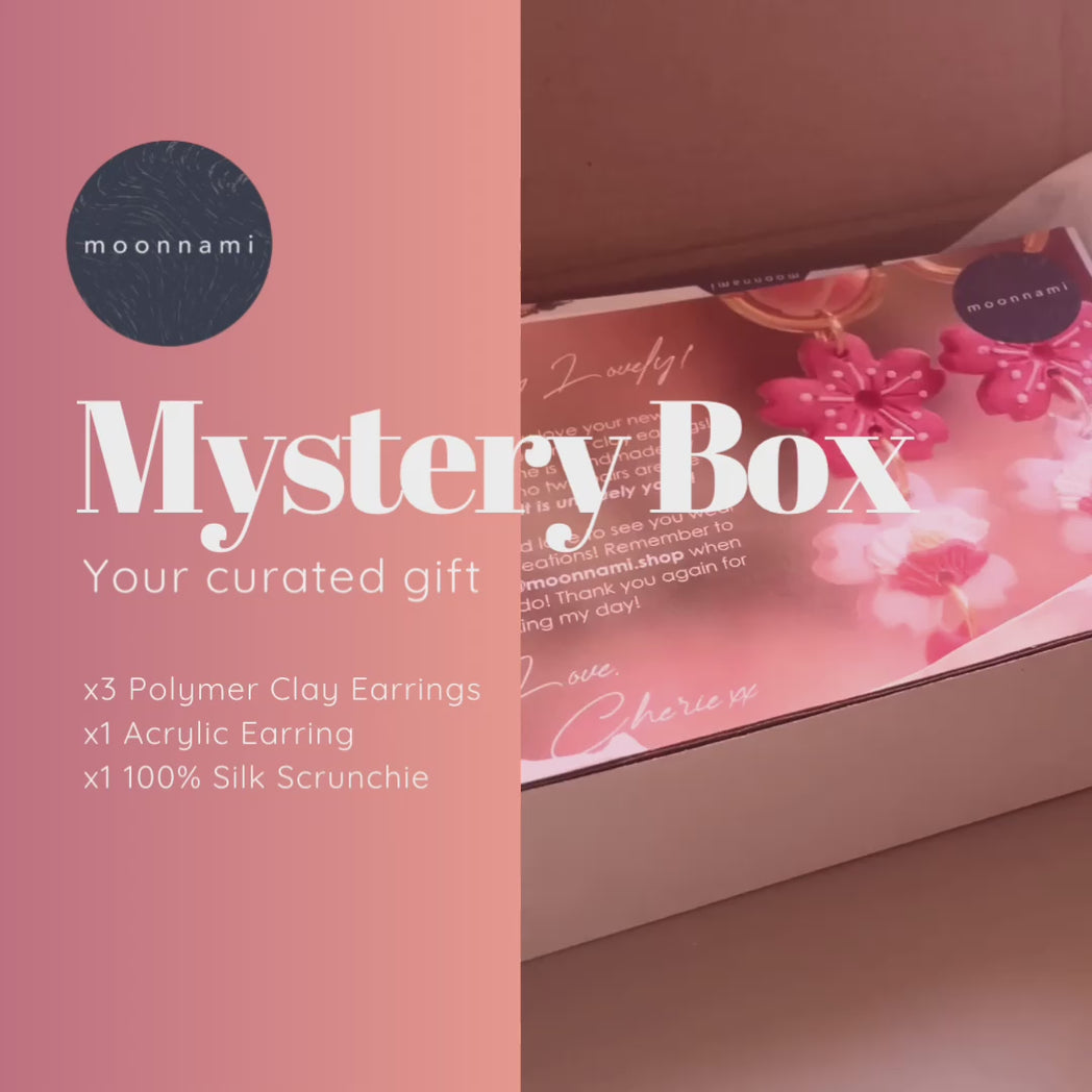 The Mystery Box includes: x3 Polymer Clay Earrings, x1 Acrylic Earrings and x1 Mulberry Silk Scrunchie. I promise these will be super special and all the design styles are pieces from my website so you somewhat know what you're getting but it'll still be a nice surprise!
