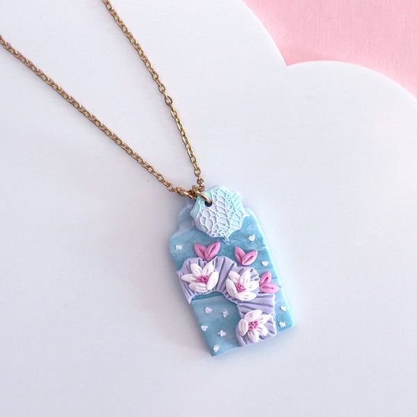 Three dancing lotus floating on a lilac lily pad. This dreamy necklace is in the perfect size, adding a touch of magic to your outfit!