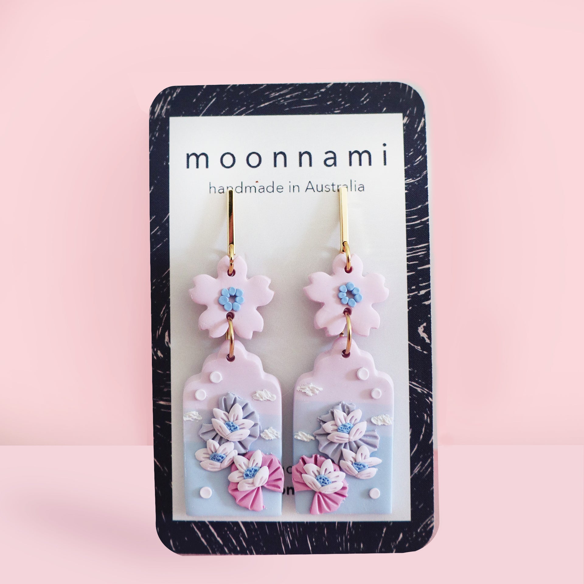 Soft blue and pink gradient, filled with detailed lotus flowers floating on lily pads. This pair of lightweight dreamy earrings in the Fairytale collection measures approximately 2cm wide by 6cm length.
