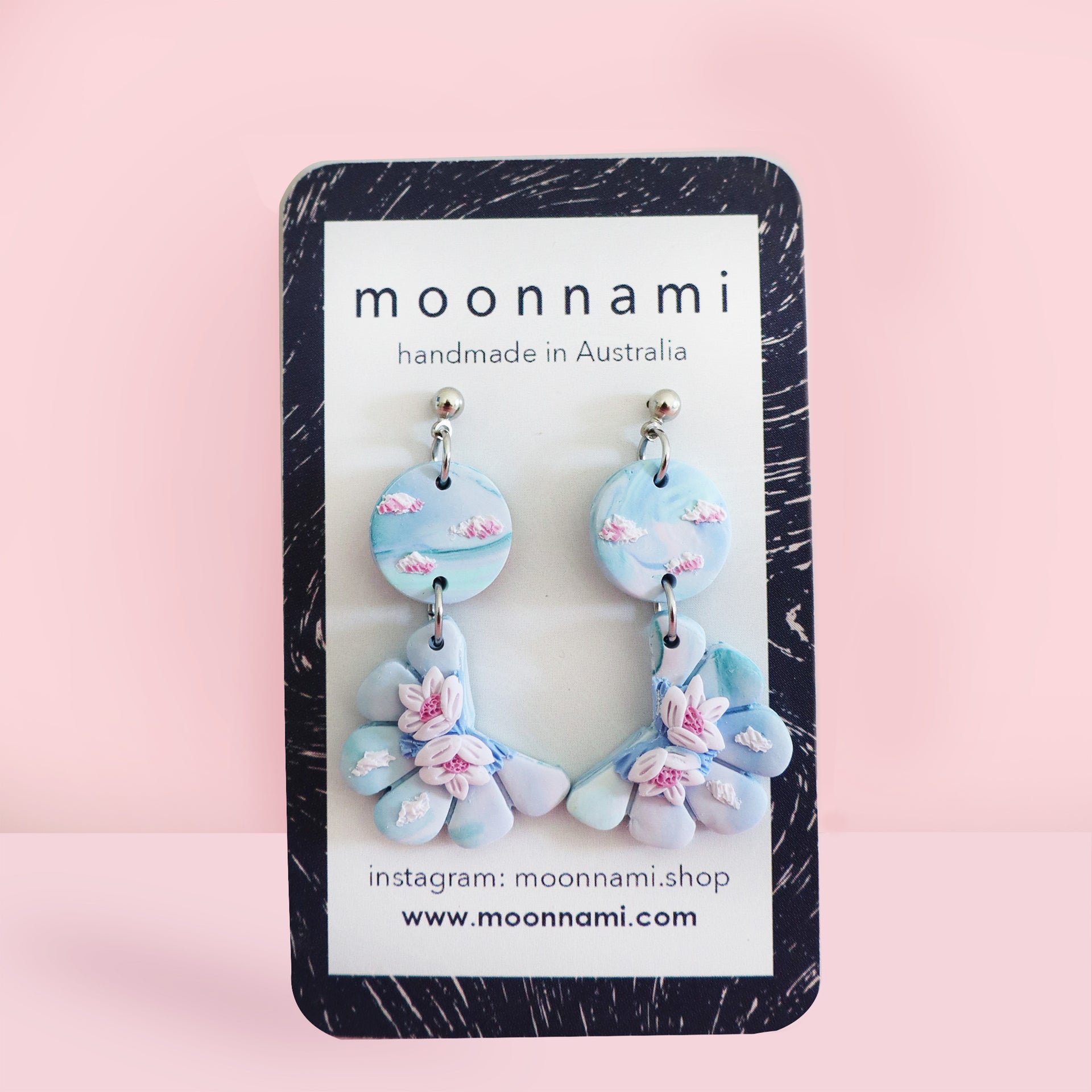 Soft blue, lilac gradient, filled with detailed lotus flowers on blue lily pad. This pair of lightweight dreamy earrings in the Fairytale collection measures approximately 2cm wide by 5cm length.