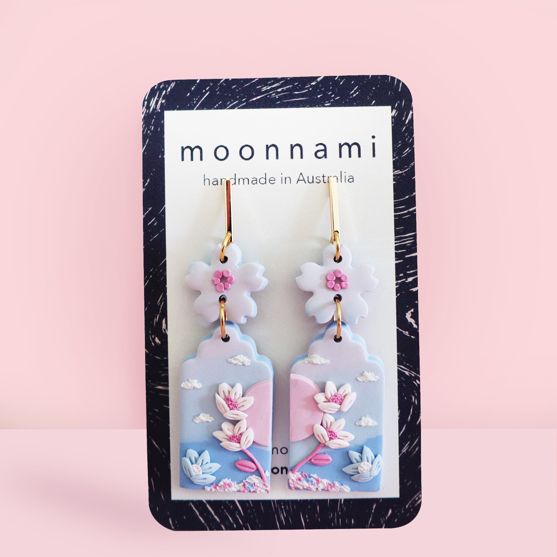 Soft blue and lilac gradient, filled with detailed lotus flowers suspended on a pink moon. This pair of lightweight dreamy earrings in the Fairytale collection measures approximately 2cm wide by 6cm length.