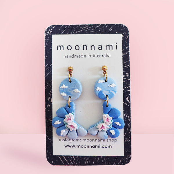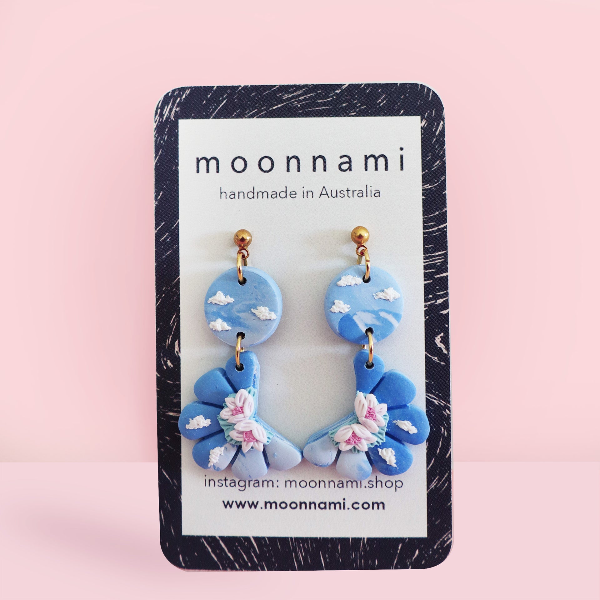 Soft blue gradient, filled with detailed lotus flowers on teal lily pad. This pair of lightweight dreamy earrings in the Fairytale collection measures approximately 2cm wide by 5cm length.