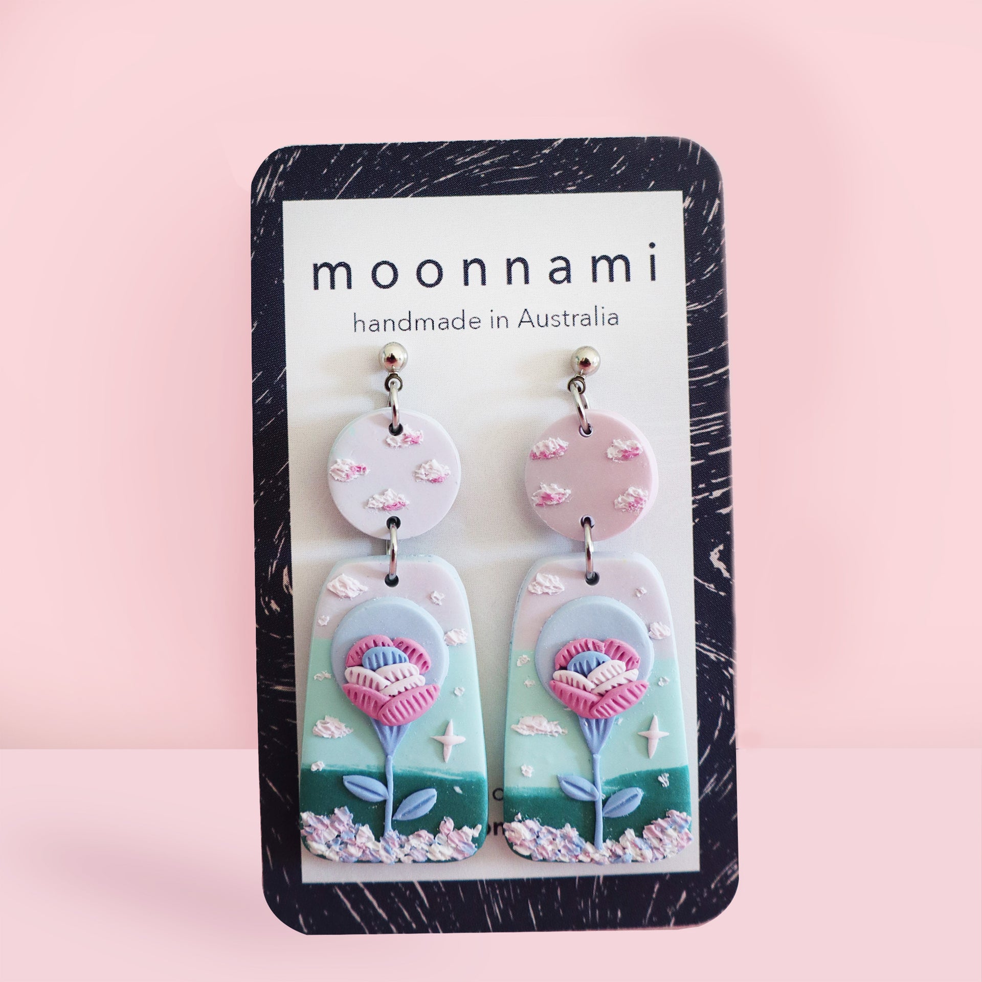 Soft teals and lilac, filled with Moonflowers in a dreamy teal garden. This pair of lightweight earrings in the Fairytale collection measures approximately 2cm wide by 6cm length.